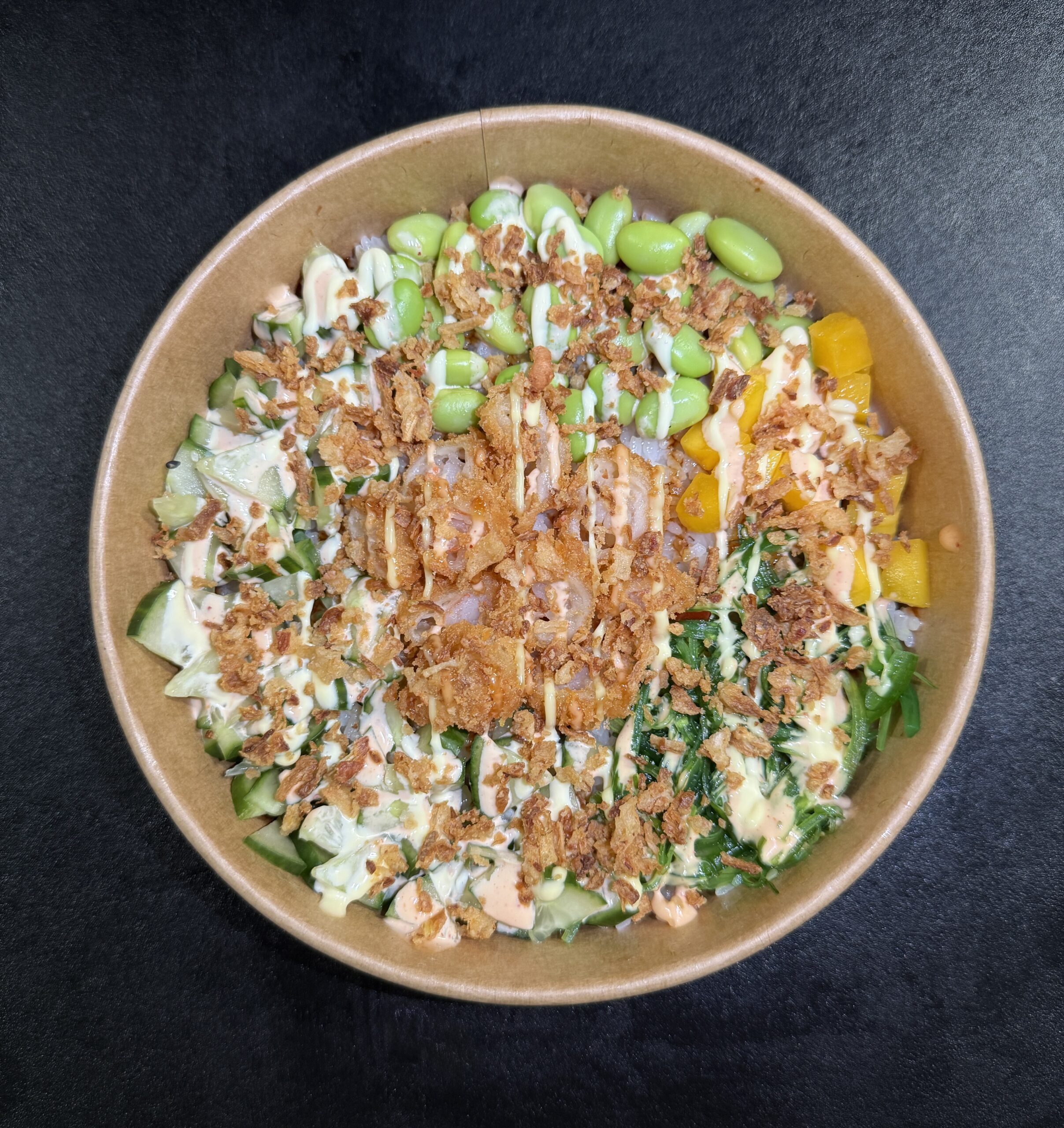 pokebowl pittige gefrituurde garnaal lunch bowl